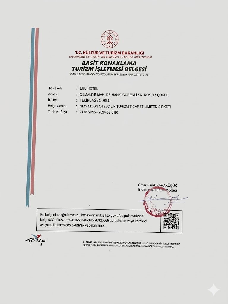 Söz konusu belgeler, ilgili mülklerin Türkiye Turizm Tanítma ve Geliştirme Ajansı’na kayıtlı, yasal ve denetimli konaklama birimleri olduğunu teyit etmektedir. Misafirlerimiz bu dairelerde konaklamalarının her açıdan güvenli, şeffaf ve mevzuata uygun olduğundan emin olabilirler.